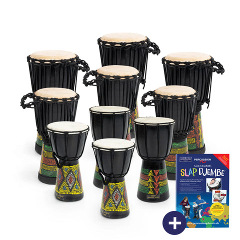 • Pack contents: 4x5”, 5x6”, 5x7”, 5x8”, 1x10” djembes & book